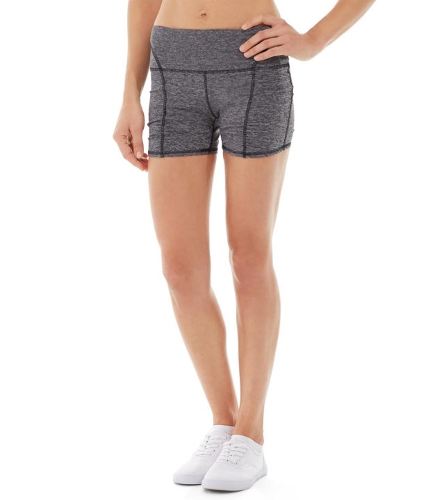 • Dark heather gray rouched bike shorts.