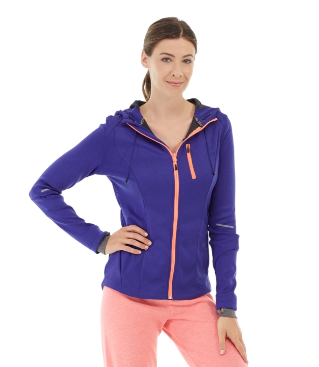 • Purple full zip hoodie with pink accents.